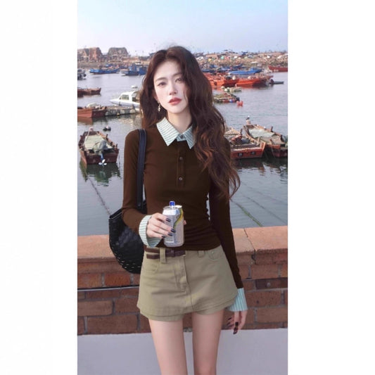 Chic Plaid Spliced Mock Two-Piece Fitted Polo Neck Top for Women