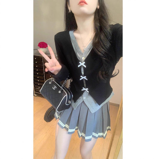 Color Block Fake Two-Piece V-Neck Long Sleeve T-Shirt Women Slim Fit Bow Short Top